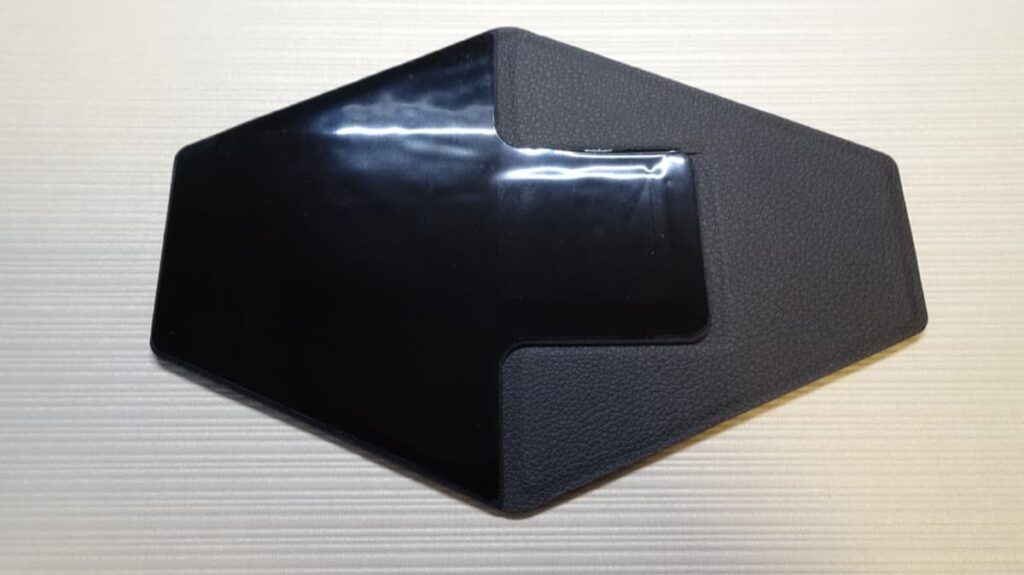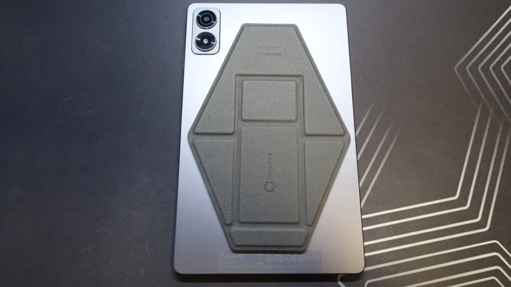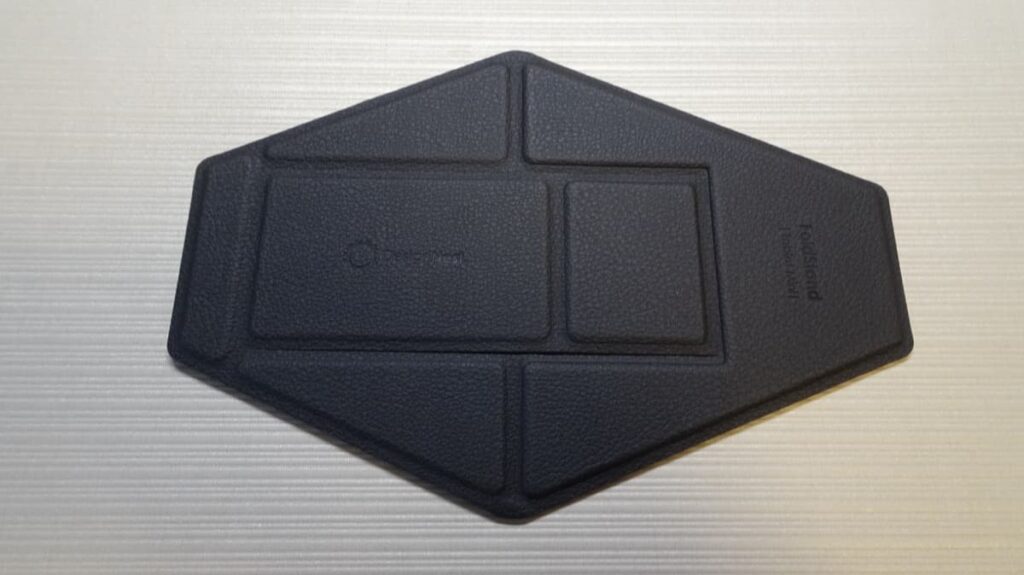 本体は縦長六角形。MOFT Xよりも面積が小さいこともあり、その分軽量となっています。MOFT Xは87g、FoldStand Tablet miniは44gということで、持った時の感覚はそこまで重くなった感じはしないという体感です。下半分ほどが粘着面となっています。