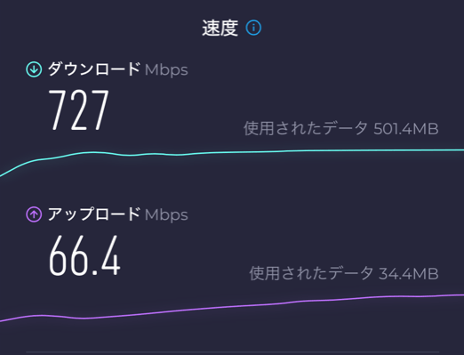 モデム交換後のスピードテストの結果はなんと、下り727Mbps、上り66.4Mbps。今まで体験したことのない速度でした。